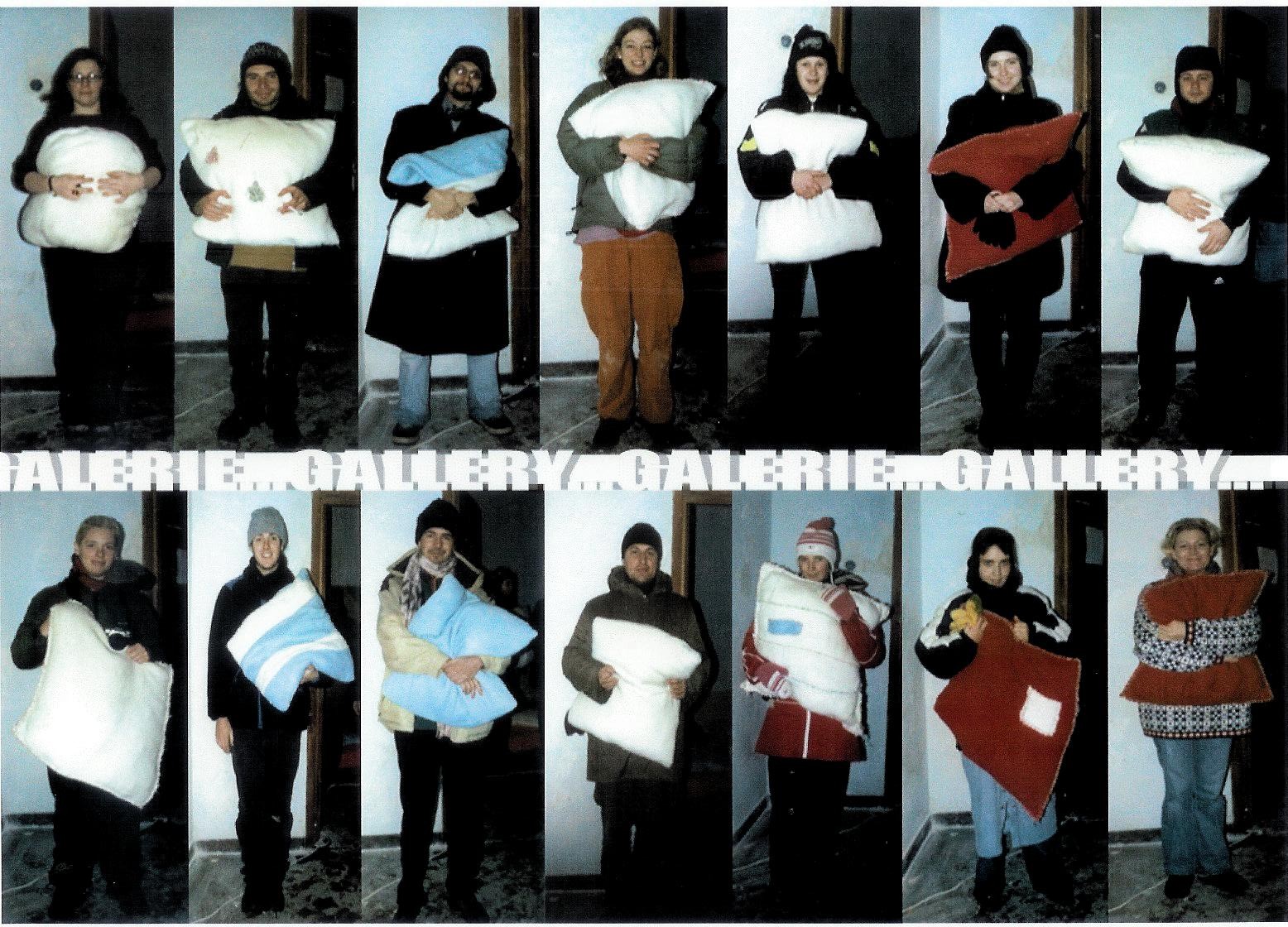 J’ai confectionné à la main 19 coussins tous différents et chacun a pu choisir son coussin, comme une adoption. J’ai ensuite demandé a chacun de poser avec son coussin afin d’avoir un ensemble et de voir comment chacun d’entre nous, nous nous comporterions avec cet objet. Quelle posture, attitude allait apparaître. Tous sont repartis dans leur pays avec leur coussin. j’ai encore le mien chez moi.