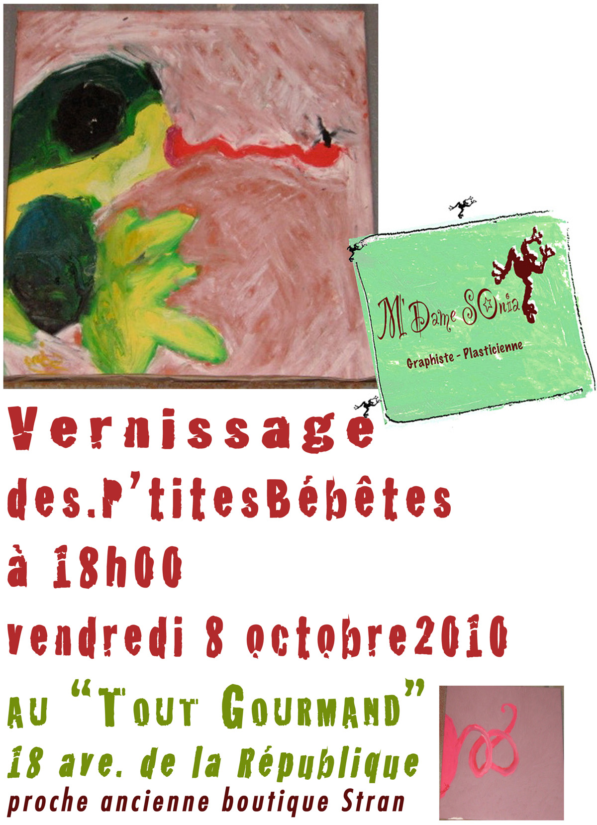 Evènements, Graphisme Vernissage Date: 9 octobre 2010Author: mdamesonia 0 Commentaires vernissage de l’exposition au tout gourmand le vendredi 8 Octobre 2010 à 18H Merci a toutes les personnes qui sont passés ce jour, ça fait plaisir Encore Merci J’aime chargement…